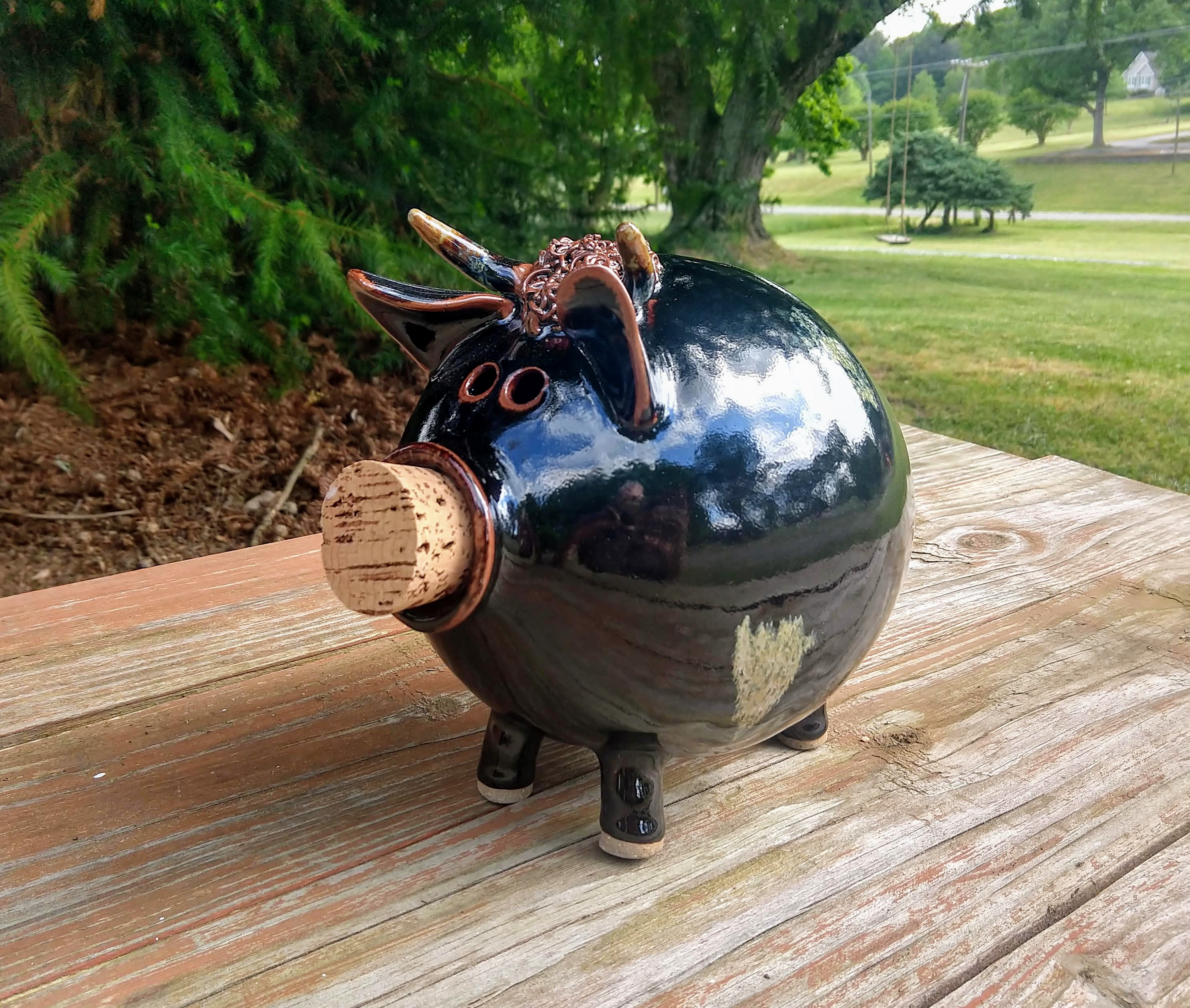I had an order for a Bull piggy bank. They buyer didn't want white with black spots so we settled on this combination. I am really pleased with the results. They raise cattle so this is going to be sitting in their kitchen.